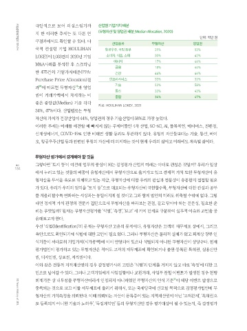자산의 가치가 건강산업이 44%, 영업권의 경우 기술산업이 58%로 가장 높았다.
