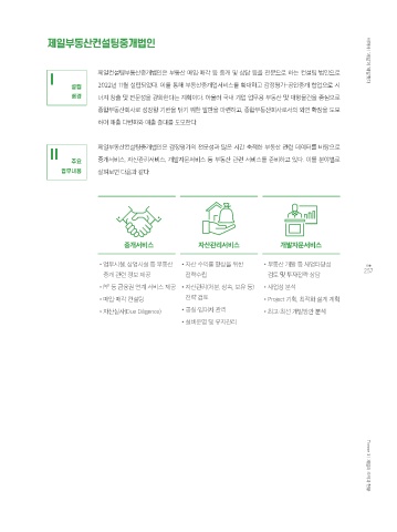 주요 중개서비스, 자산관리서비스, 개발자문서비스 등 부동산 관련 서비스를 준비하고 있다. 이를 분야별로