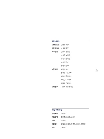 편찬위원회 명예위원장 임학종 회장 편찬위원장 남영식 고문 부위원장 김준옥 부회장 송계주 부회장 류종억 부회장 송영석 감사 정상기 감사 편찬위원 김영순 이사 303 장세충 대표이사 김대건 총무이사 박진영 재무이사 김사왕 기획이사 편찬실무 기획부 최은경 차장 도움주신 분들 총괄제작 배기수 기획진행 정윤희, 김사라, 신채은 집필 장세진 디자인 전영인, 김유진, 고충열, 김선리, 신지연 촬영 이명철