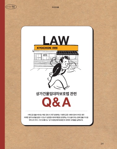 파드닭 법률 SECTION LAW 상가건물임대차보호법 관련 Q&A <파드닭 법률>에서는 매장 운영 시 자주 발생하는 다양한 갈등 사례와 함께 이러한 경우 어떠한 법적 보호를 받을 수 있는지 설명함으로써 매장을 운영하는 데 도움이 되는 알짜 법률 지식을 전하고자 한다. 이번 호에서는 ‘상가건물임대차보호법’과 관련한 사례들을 살펴보자. 24 24