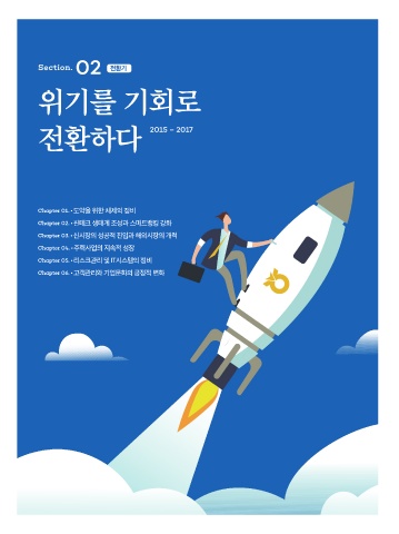 행복한 금융, 사랑받는 일등 민족은행 전환기 위기를 기회로 전환하다 2015 – 2017 Chapter 01. • 도약을 위한 체제의 정비 Chapter 02. • 핀테크 생태계 조성과 스마트뱅킹 강화 Chapter 03. • 신시장의 성공적 진입과 해외시장의 개척 Chapter 04. • 주력사업의 지속적 성장 Chapter 05. • 리스크관리 및 IT시스템의 정비 Chapter 06. • 고객관리와 기업문화의 긍정적 변화 130