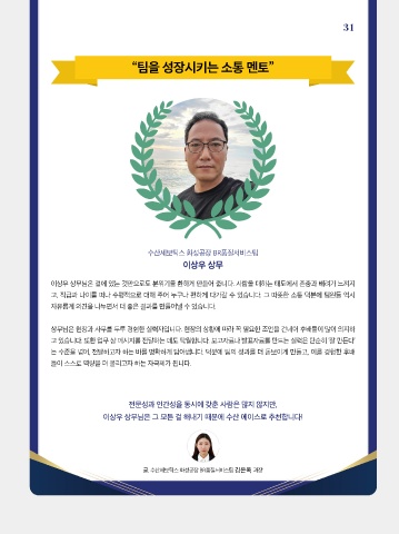 이상우 상무님은 곁에 있는 것만으로도 분위기를 환하게 만들어 줍니다. 사람을 대하는 태도에서 존중과 배려가 느껴지