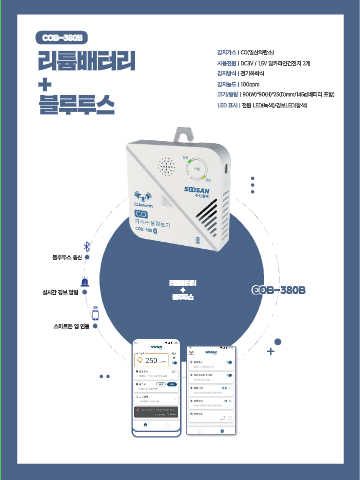 COB-380B 리튬배터리 감지가스 | CO(일산화탄소) 사용전원 | DC3V / 1.5V 알카라인건전지 2개 + 감지방식 | 전기화학식 감지농도 | 100ppm 블루투스 크기/중량 | 90(W)*90(H)*25(D)mm/145g(배터리 포함) LED 표시 | 전원 LED(녹색)/경보LED(황색) 블루투스 통신 리튬배터리 실시간 경보 알림 + COB-380B 블루투스 스마트폰 앱 연동