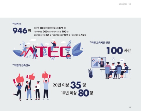 Part.04 | APPENDIX / 부록 직원 수 946 명 에이텍 110 명 / 에이텍모빌리티171 명 에이텍씨앤 200 명 / 에이텍시스템 100 명 에이텍아이오티 30 명 / 에이텍에이피 270 명 / 에이텍오토 65 명 직원 교육시간 연간 100 시간 직원의 근속연수 35 20년 이상 명 10년 이상 80 명 185 185